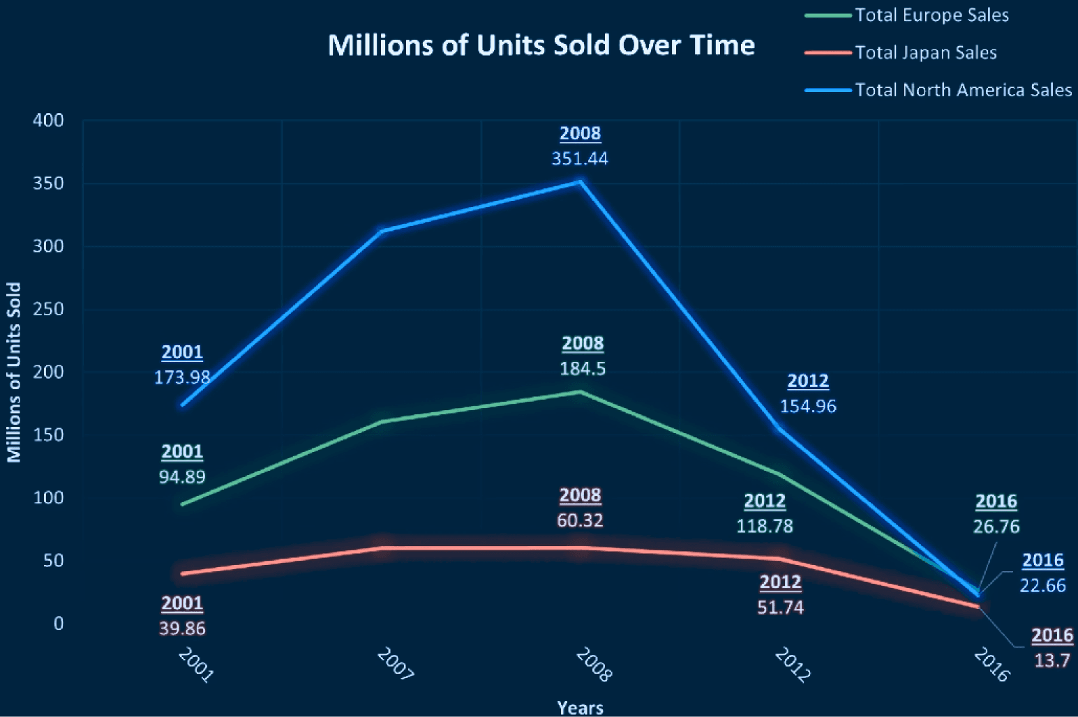 After peaking in 2008 and plummeting, Europe's total sales reached 26.76 million units by the end of 2016, the highest among all regions. This presents GameCo with an opportunity to boost sales volume globally for our upcoming 2017 distribution.