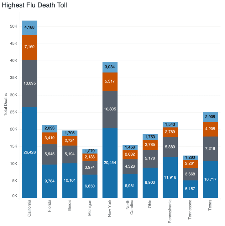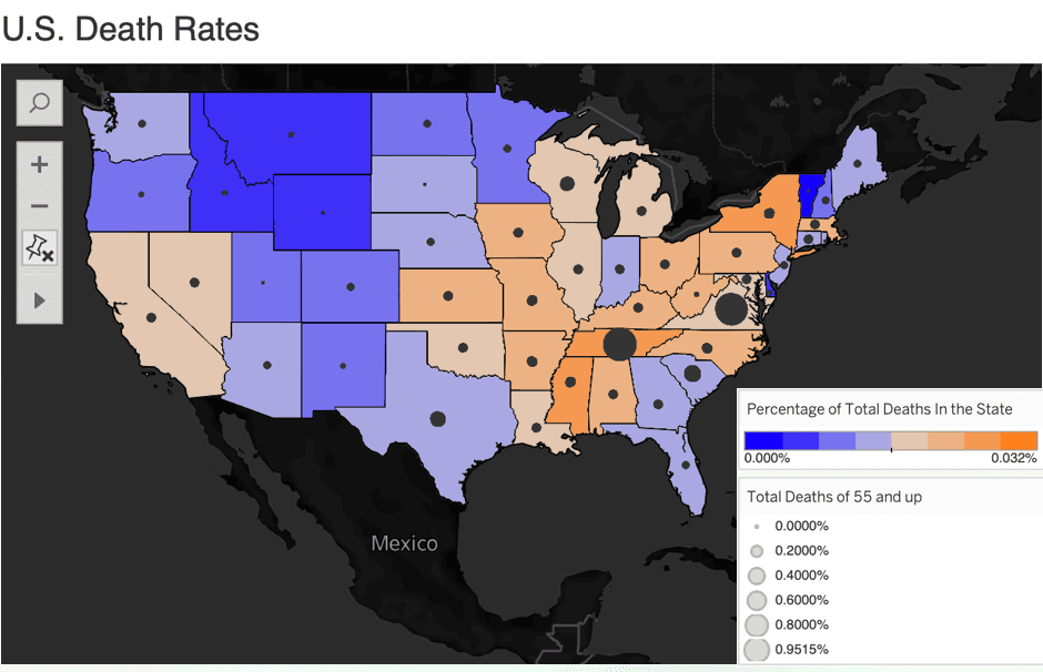 Lowest and highest death counts mapped with bullets displaying the number of higher risk patient deaths.